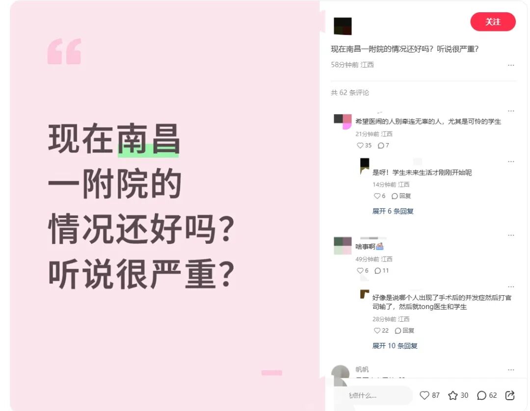 记者注意到,在相关帖子评论区,一位IP地址显示为“江西”的网友回复称“学生左手指肌腱外伤,主任和学生都无生命危险”。记者私信对方,暂未获回复。